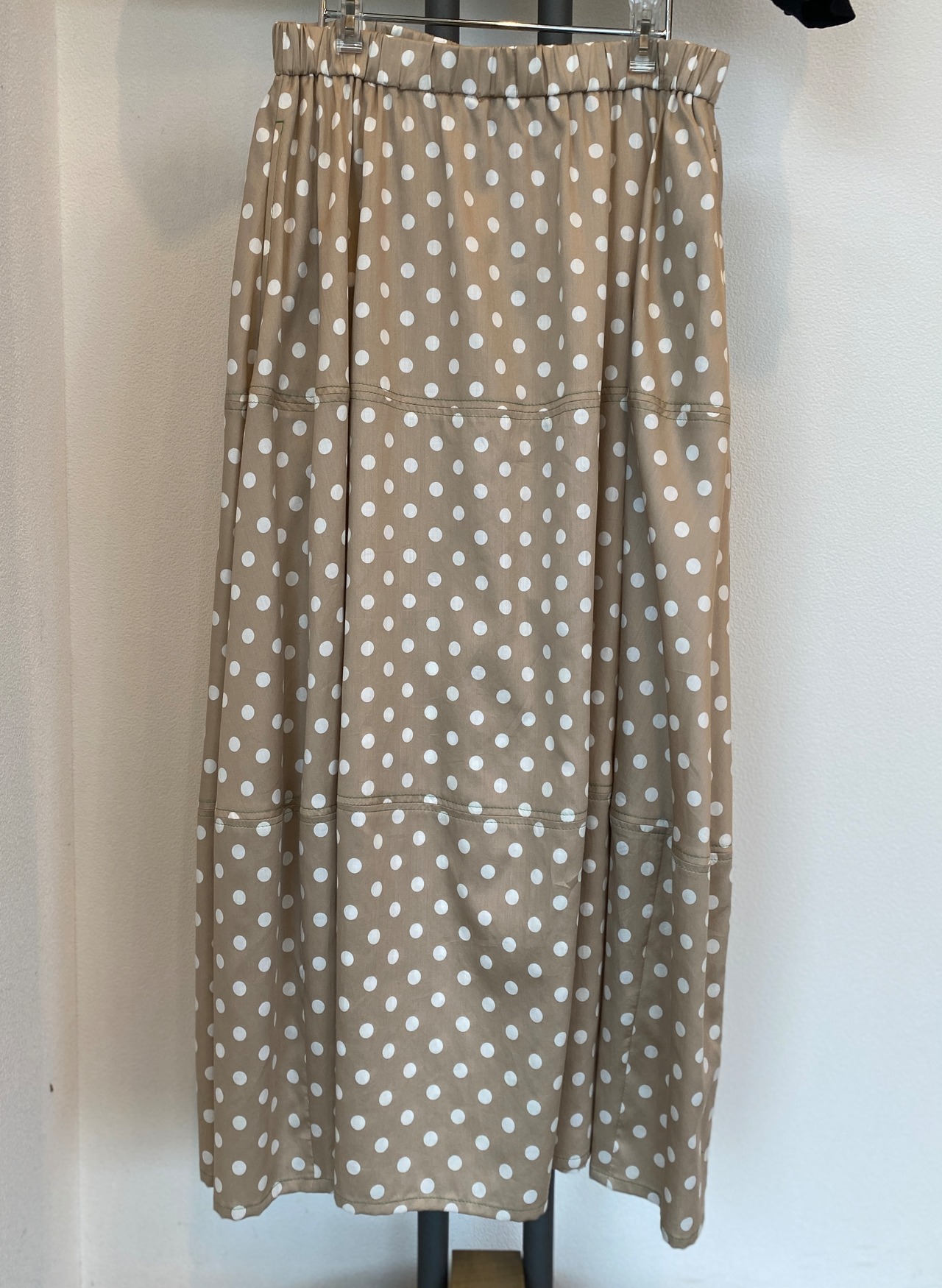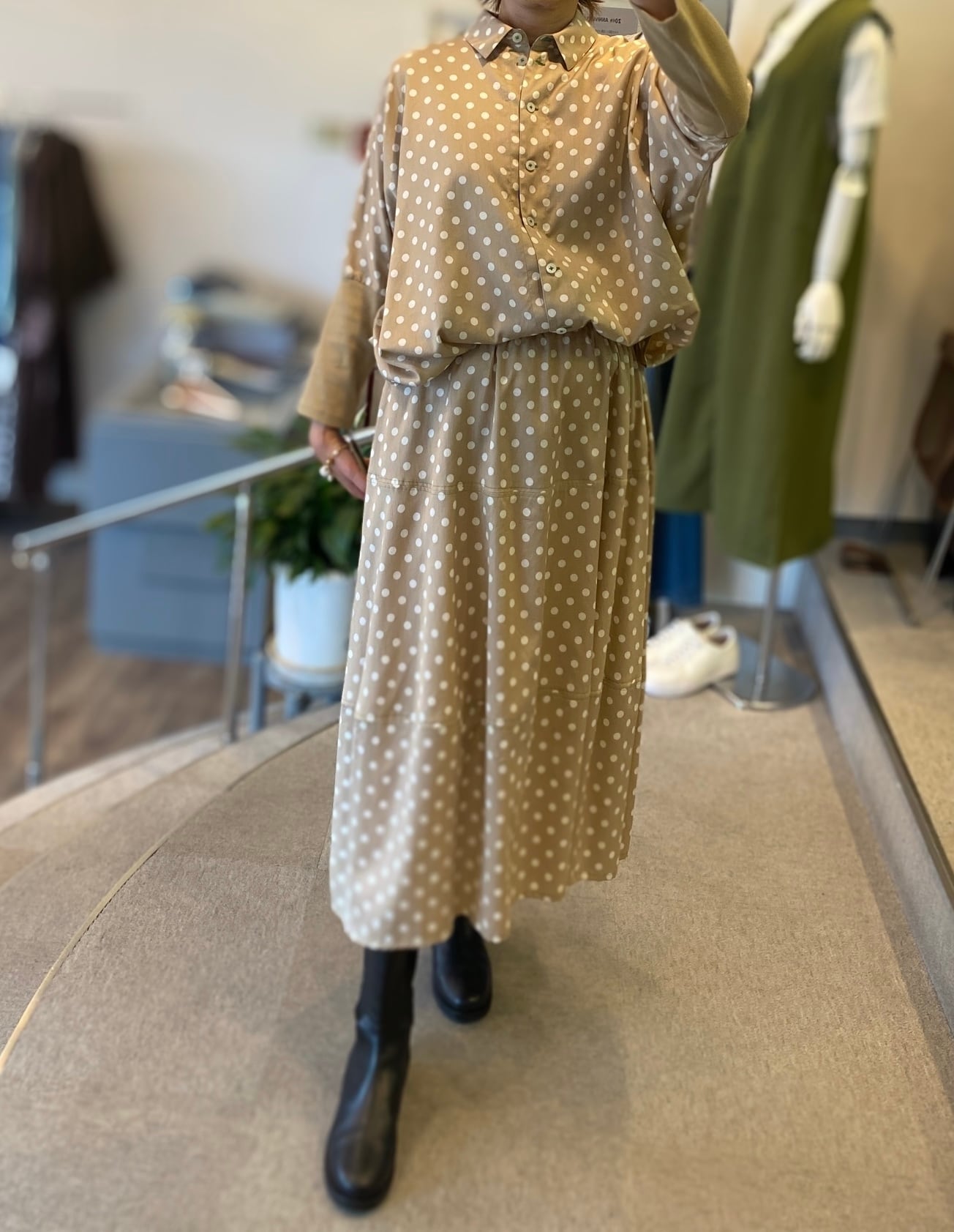 ・コットン素材を使用した、かわいらしいドット柄が特徴のスカートです。 ウエストゴムで楽に履いて頂けます。