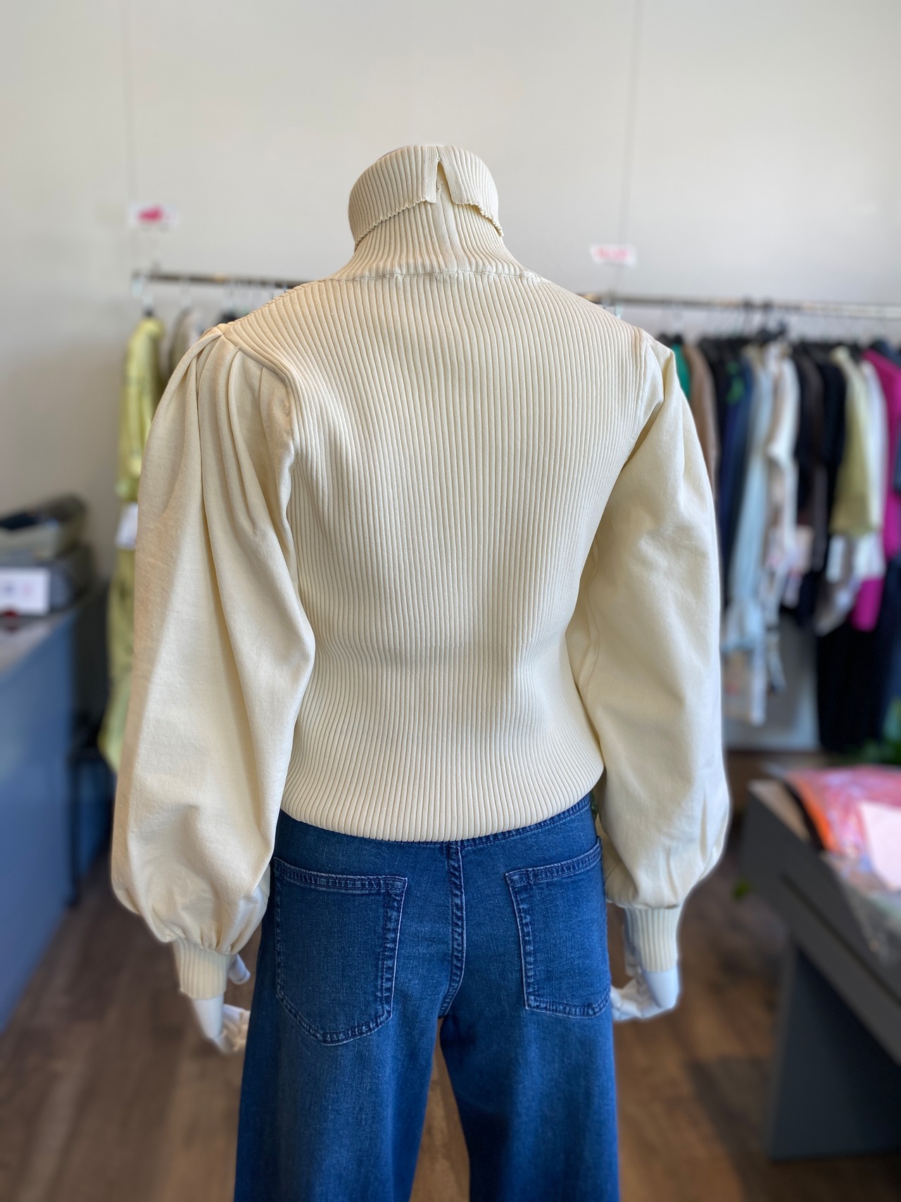 へたらないタートルネックと、形状保つふんわり袖のシルエットです。