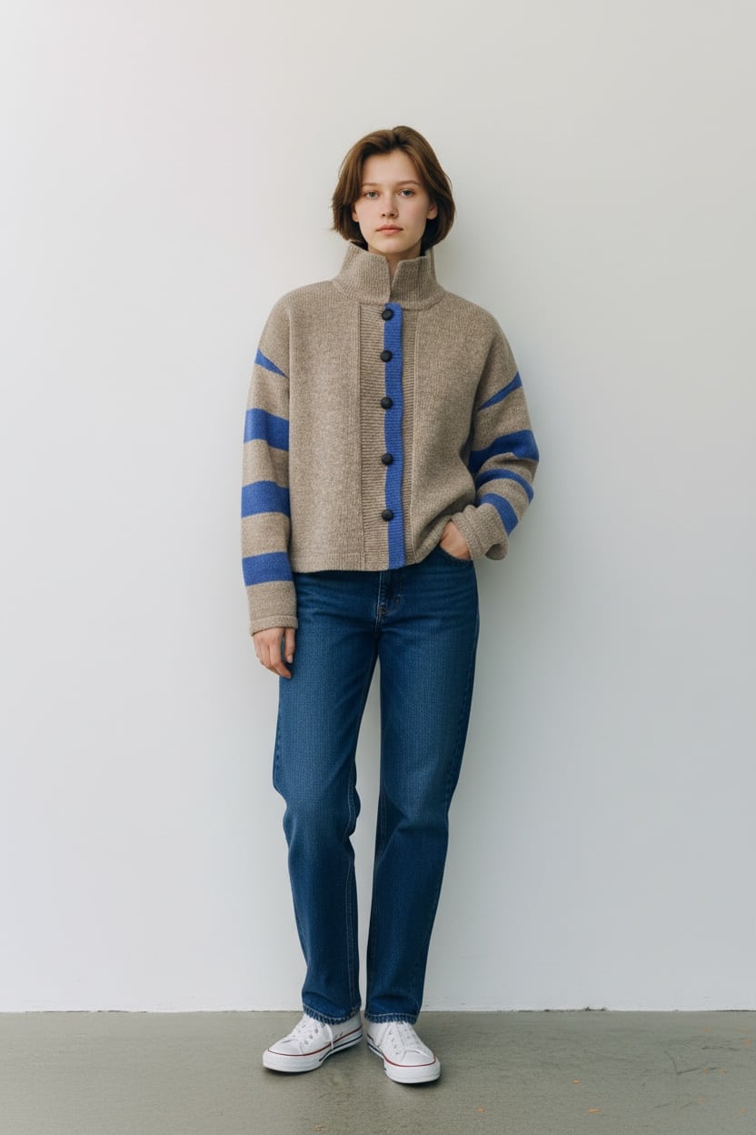 襟付きニットカーディガン ベージュ/ブルー