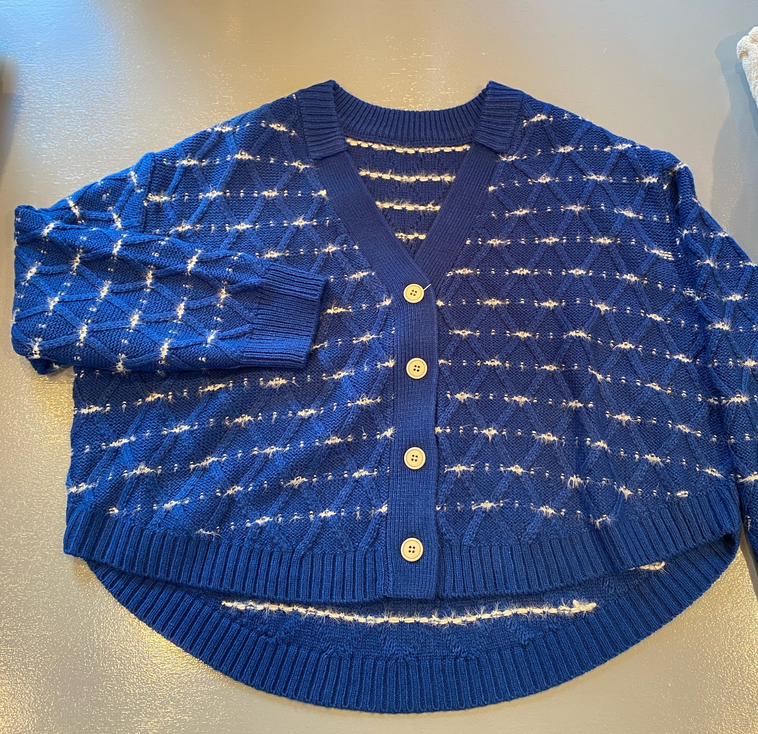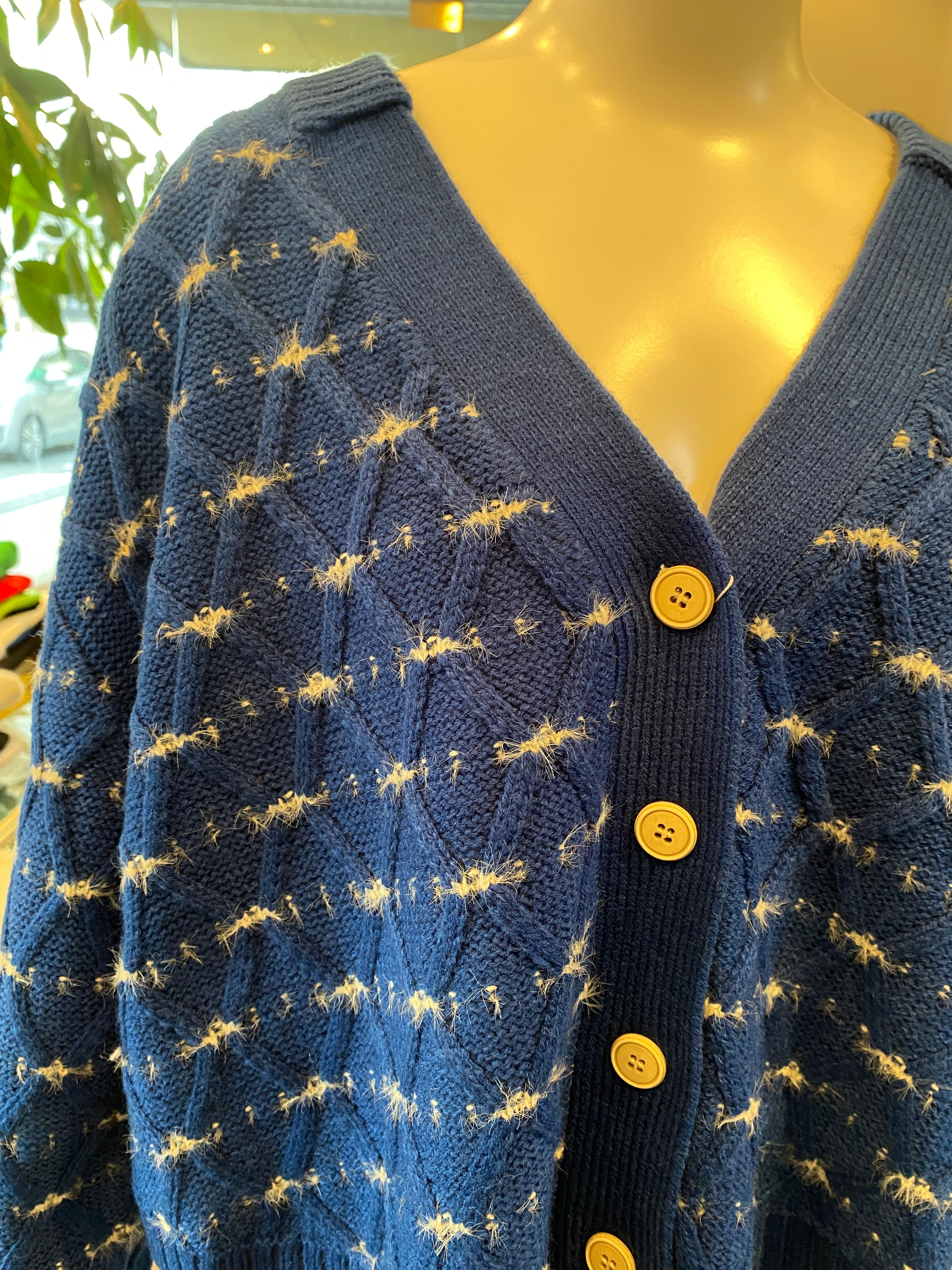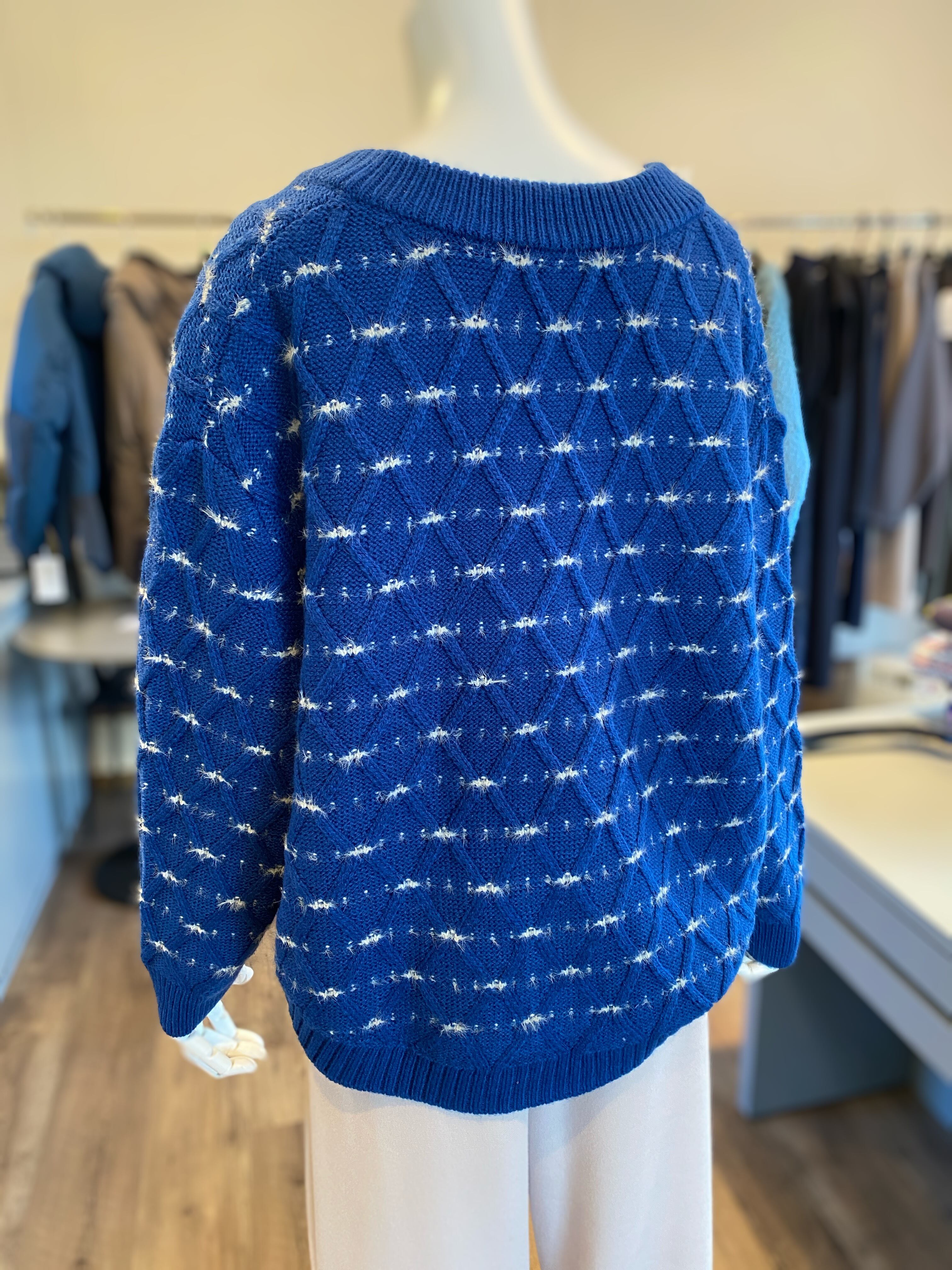 ブルーのきれいな色合いが魅力的なショート丈ニット。アクリル70%とナイロン16%、毛14%の素材を使用しており、肌触りも軽やかで快適です。小さめサイズの方にもスタイル良く見せるデザインが特徴で、あしなが効果も期待できる一着です。