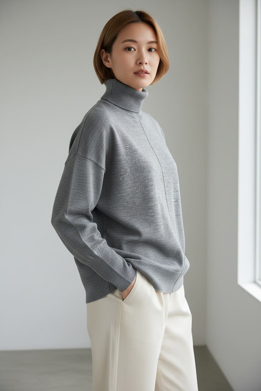 スタイルを美しく見せる丈感は体型カバーにも。1枚で着用するのはもちろん、ジャケットやコートのインナーとしてもコーディネートしやすく、着回しにも優れています。上質な素材感は、特別な日のおしゃれからデイリーユースまで幅広く対応します。