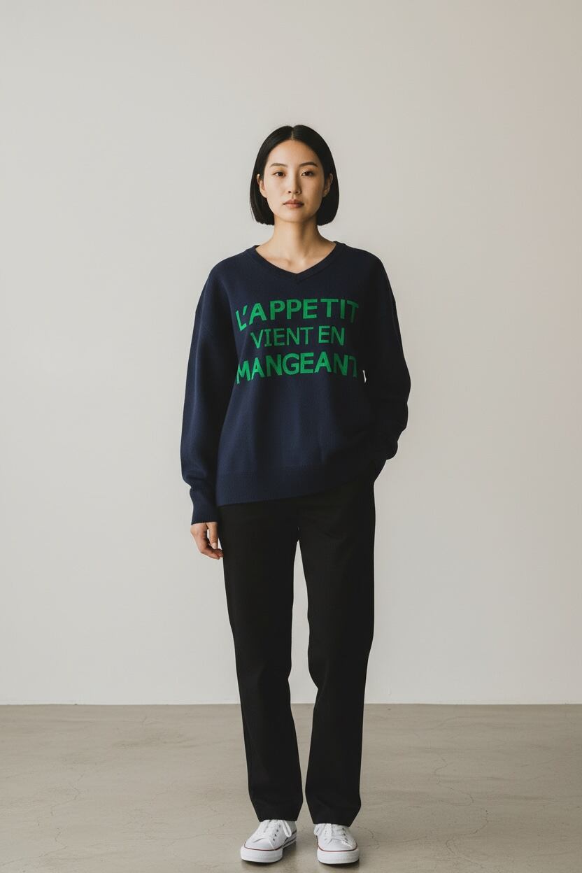 コットン100% ロゴニットは、肌触りの良い柔らかな素材感と、シンプルながらも存在感のあるロゴデザインが特徴です。