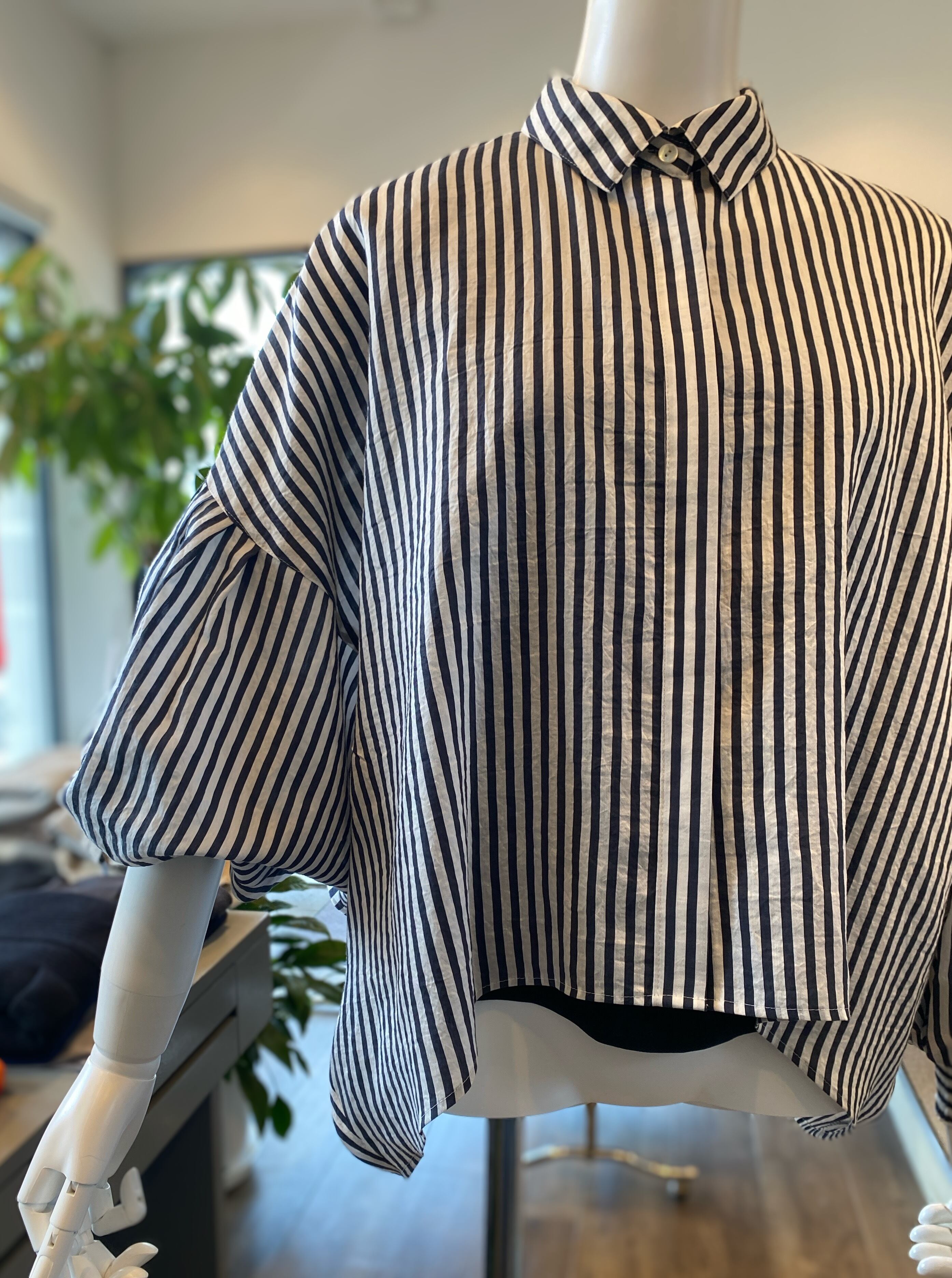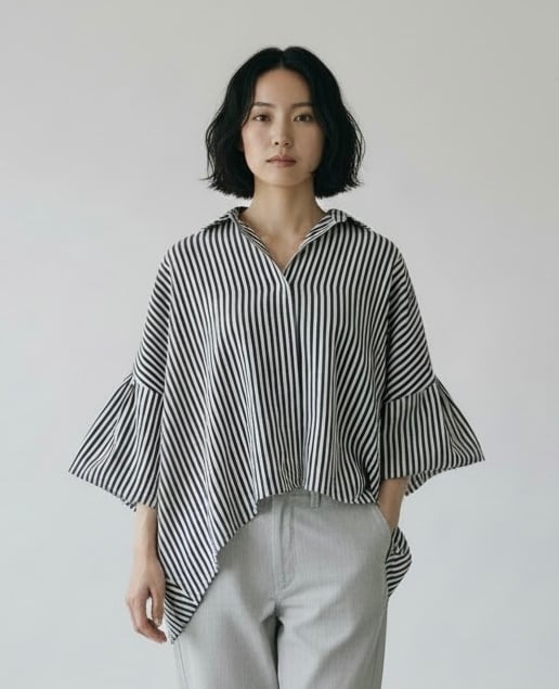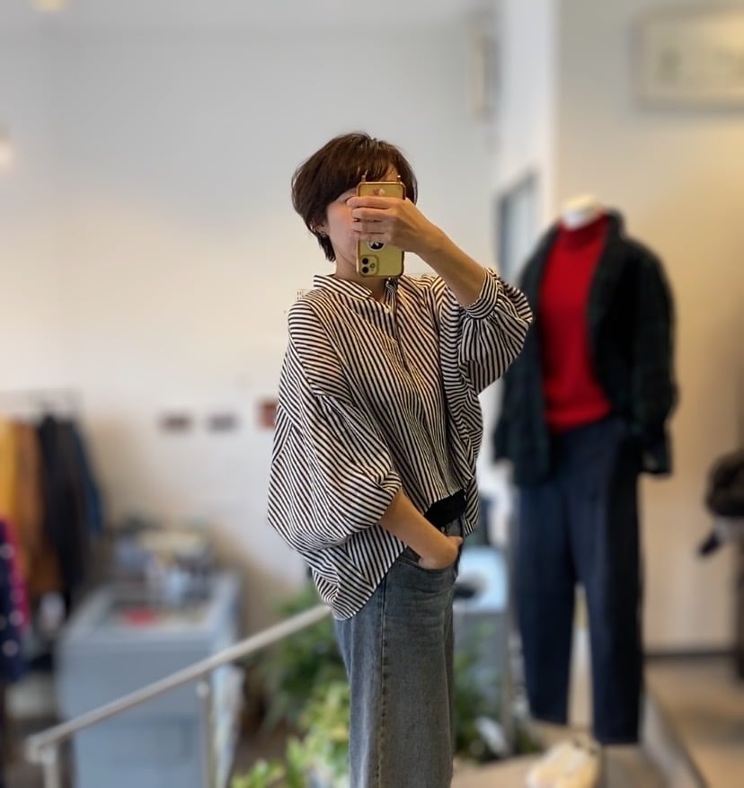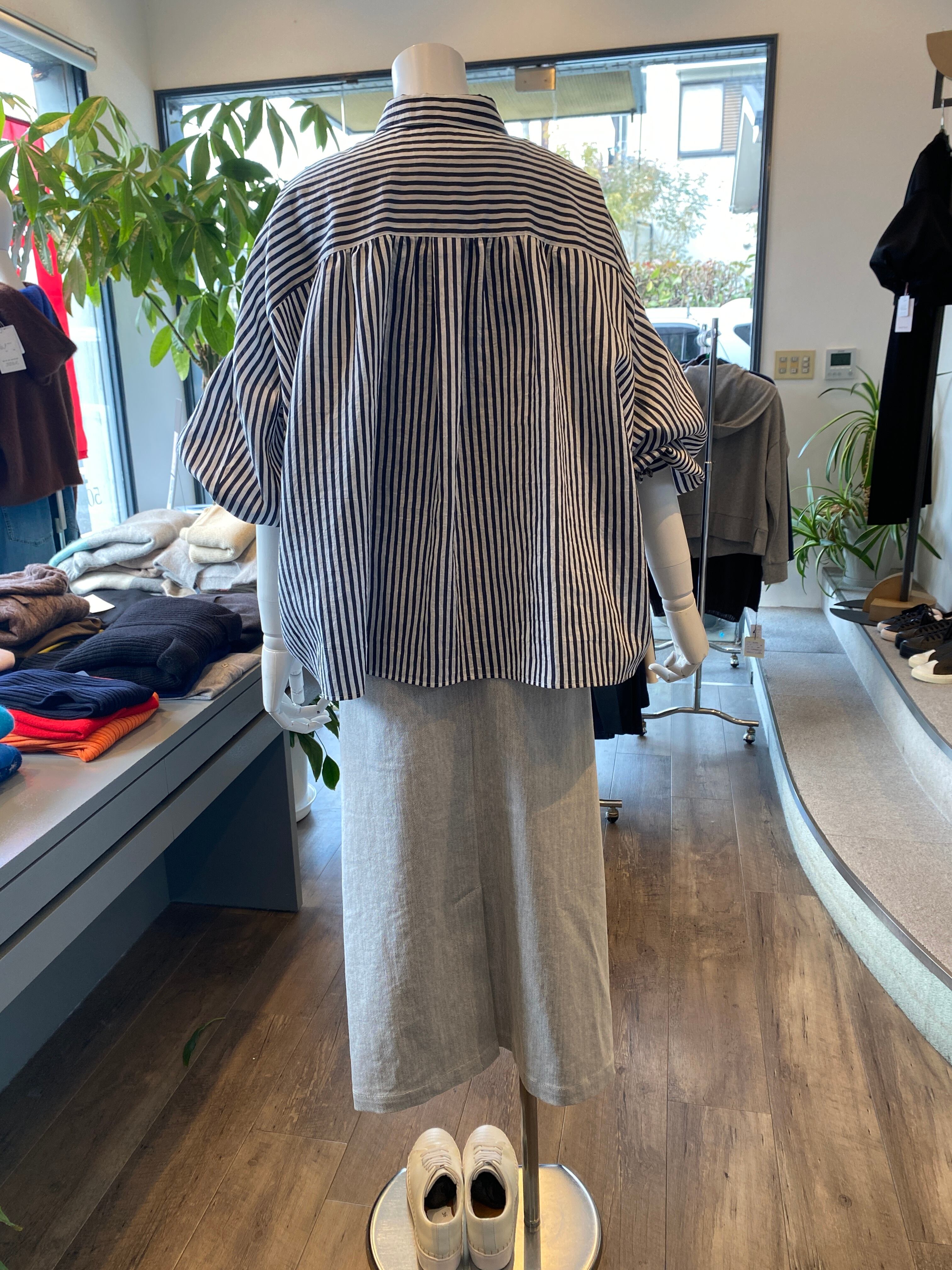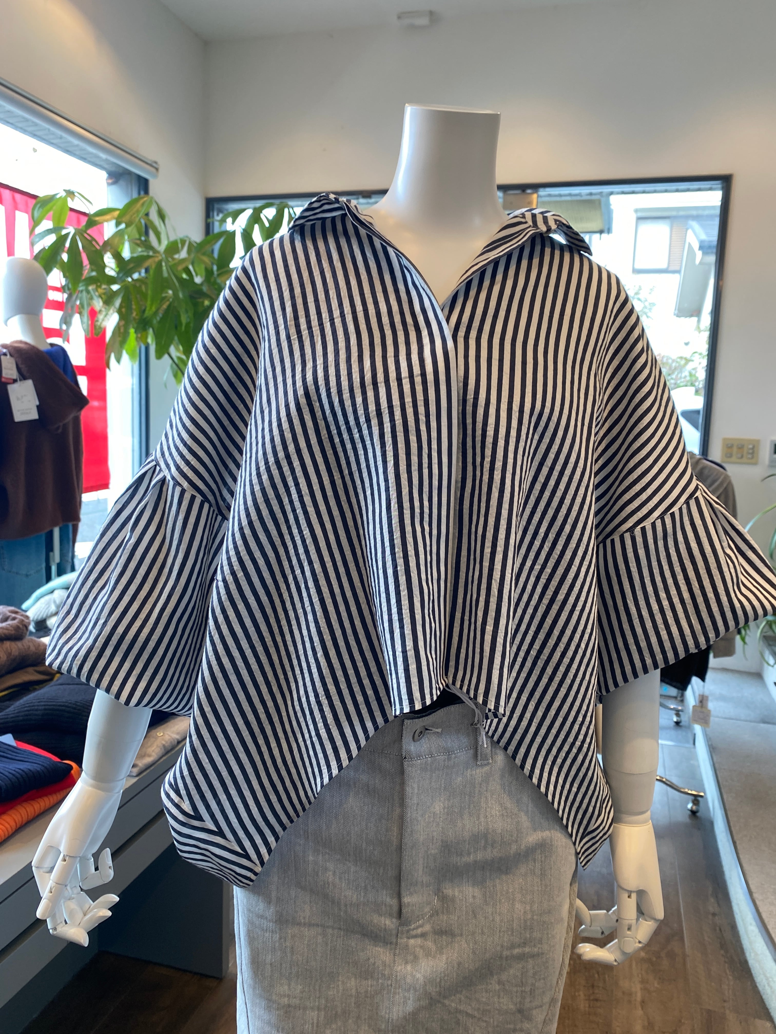 【ふんわりバルーンスリーブのストライプシャツ】