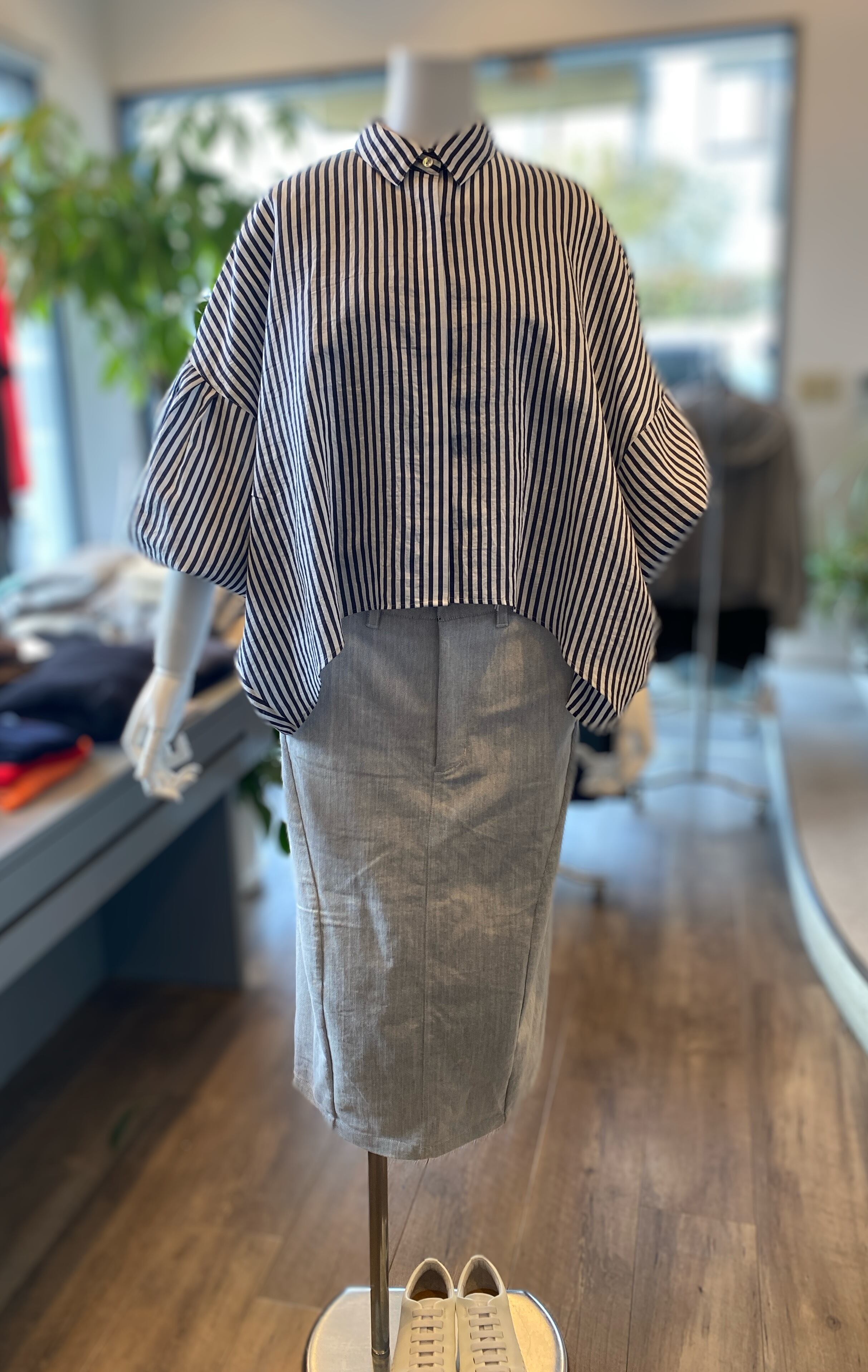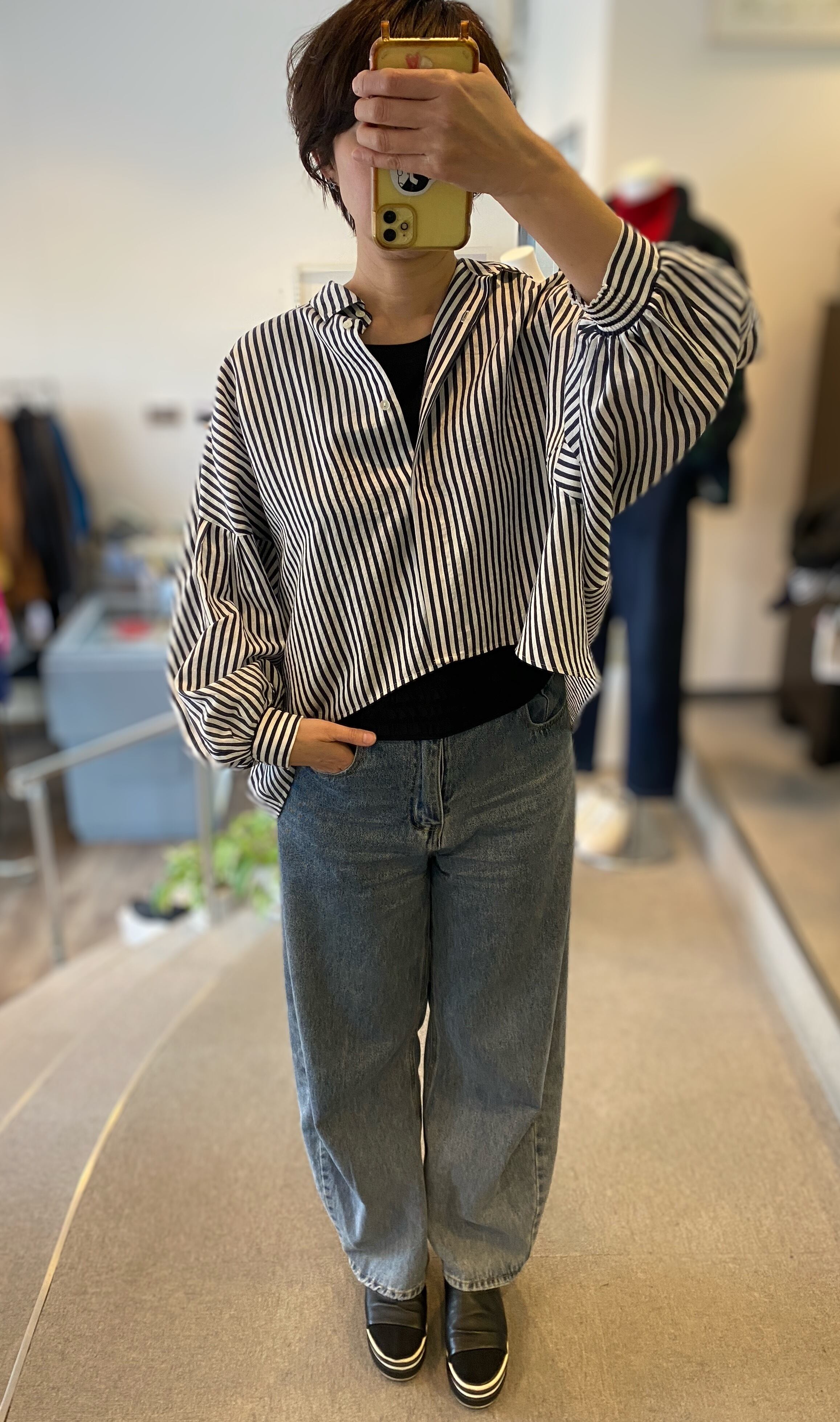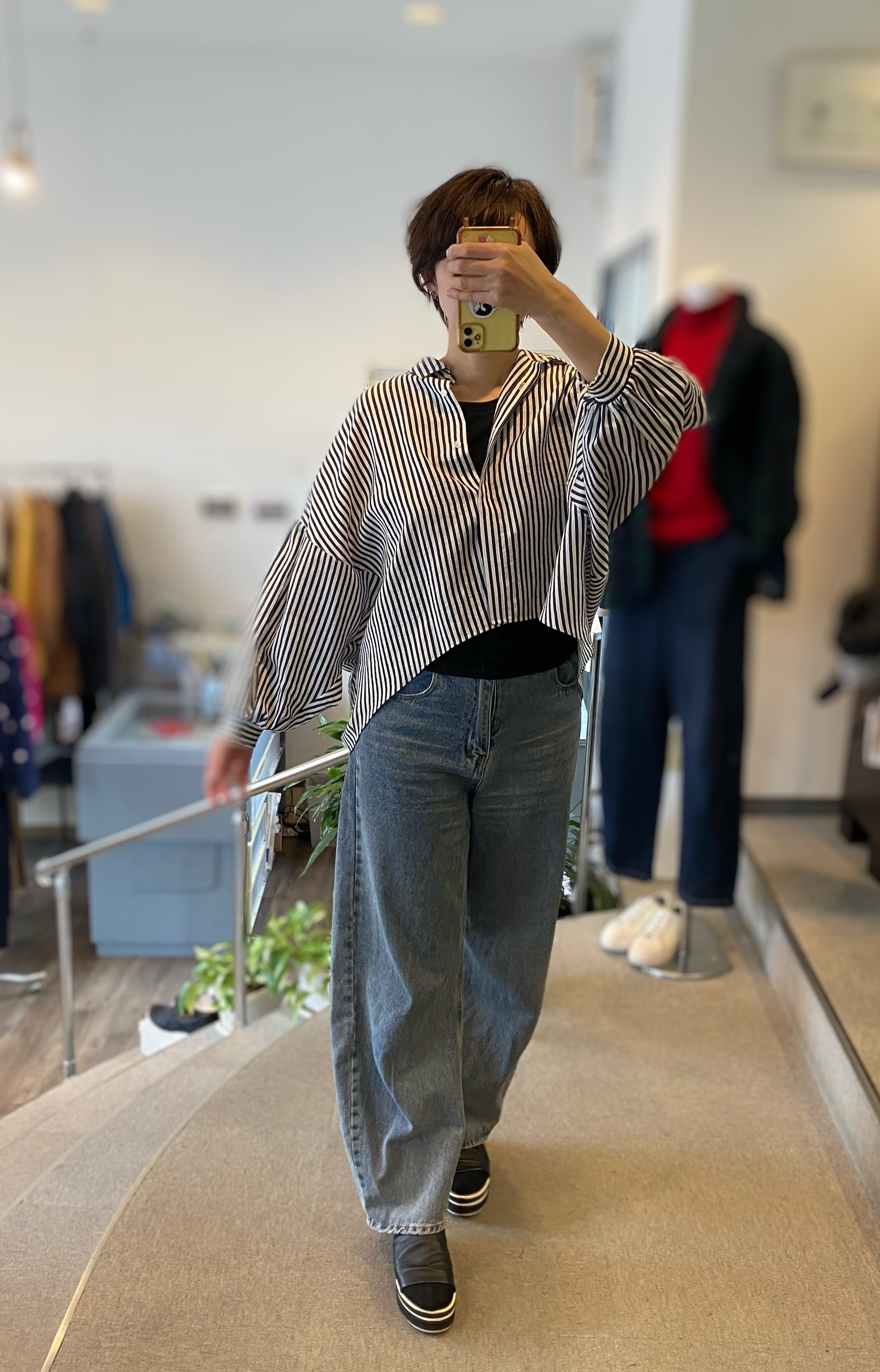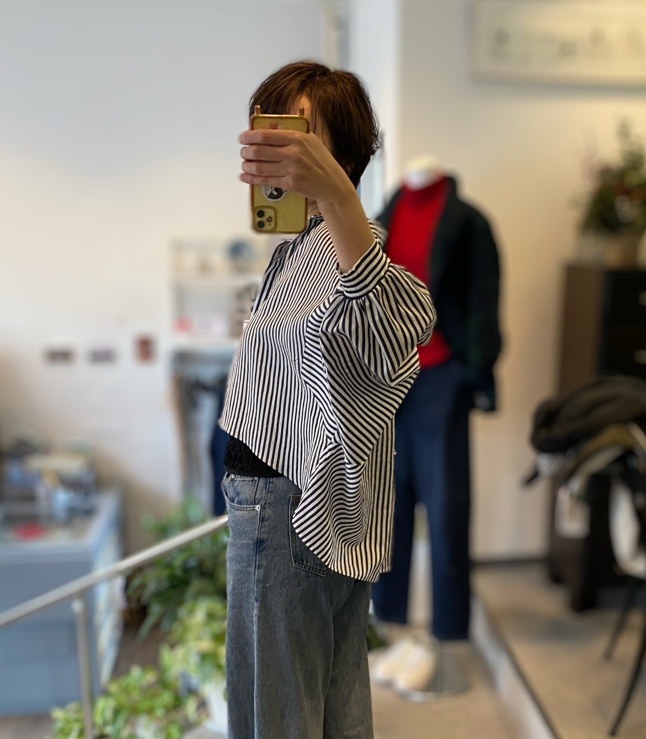 【ふんわりバルーンスリーブのストライプシャツ】